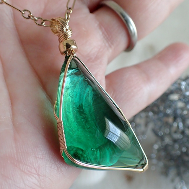 ご覧になってくださり、ありがとうございます。 シエラネバダ産アンダラクリスタル、エメラルドシフトのカボションを女神巻き®ペンダントトップにお創りしました。 深く鮮やかなグリーンに引き込まれそうです。三角形のフォルムがこのグリーンと相まって、知的な印象です。 しっかりとしたボリュームがあるのも魅力で、アンダラの底知れない豊かさを感じます。 裏側の凹凸を佳い具合に残して研磨してもらったので、光の入り方により素晴らしい陰影、輝きを放ちます。 どうか必要とされる方のサポートとなりますように! 【Instagramのリールで、動画をご覧頂けます】 https://www.instagram.com/reel/DP5n7UFgTM6/?igsh=MTFoY25sY3dsZmN6Yw== <ジュエリーのひとことメッセージ> 魂の記憶をたどって、 今世、その望みを体験していくために 宇宙の叡智を受け取ります。 アンダラクリスタルは、アメリカ・シエラネバダ山脈の麓、ネリーランドと呼ばれる土地から採掘される色とりどりの不思議な石で1967年、レディ・ネリー女史により発見されました。 その後、インドネシア、南アフリカでも同様のクリスタルが発見されるようになりました。 アンダラクリスタルは天然ガラスですが、エネルギー測定を行うと非常に高い波動を示すそうです。 とても新しく、今までにない波動で、宇宙と繋がることができるクリスタルと言ってもよいでしょう。 --------------------------- 今回のテーマは【メタモルフォーシス・羽化】です。 私に御縁してくださる人と、私自身も含め、『蝶が羽化するように、これまでにあった制限が外れて、自由になり、変容して次の段階へ進んでいく…』 その祈りを込めて、アカシックから受け取ったメッセージ、エネルギーを、お創りするジュエリーに添えました。 皆さんと、ますます自由で創造的な流れに乗っていけますように♡ ★9周年記念企画の詳細はこちら(この度の企画は終了しましたが、詳細を残します) https://ameblo.jp/s-tani/entry-12916633254.html --------------------------- ・ネックレスチェーンは付属していません。別売りの14kgfネックレスチェーン(40㎝/50㎝)、あるいはお好みの仕様でお作りするオーダーネックレスチェーンをご購入ください。トップページからカテゴリー『ネックレスチェーン』で検索して頂くと、ご覧になれます。 ・画像のネックレスチェーンの長さは約45㎝です。 ・ペンダントトップサイズ:縦45×横幅23×厚み11.5㎜(バチカン部含む) ・バチカン径:約3.5㎜ ・重量:10.3g(重さがありますので、ネックレスチェーンは丈夫なものをお使いください) ・シエラネバダ産のアンダラクリスタルのカボションです。 ・自然由来のクリスタルですので、色が均一ではない、不純物や傷が含まれている等の場合があります。 ・上下左右で若干の厚みの差がありますが、全体的にとても滑らかな形状です。身に着けた時の落ち着きはとてもよいです。 ・26ゲージ(太さ0.4mm)の14金ゴールドフィルドワイヤーと、同素材のロンデルを使用しています。やわらかく繊細な素材ですので、硬い物にぶつけたり、落としたりしないでください。破損の原因となります。 ・配送にはクリックポスト(封筒での簡易包装)を使用します。 【14金ゴールドフィルドについて】 ・ゴールドフィルドは、14金の層を高熱と圧力で真鍮に圧着させたものです。金メッキよりはるかに厚い層で作られているため、長時間使用していても剥げてくることはほとんどありません。手軽に本物の金の輝きを楽しめます。 ・金属アレルギーが出にくいとされていますが、すべての方に出ないというわけではありませんので、予めご了承ください。万が一異常を感じられた場合は、すみやかにご使用をお止めください。 ・汗、皮脂、化粧水等が直接触れると変色の原因となります。ご使用後は清潔な乾いた布等で優しく拭き取ってくださいますと、長く美しい状態でお楽しみ頂けます。 ・ワイヤーはとても繊細です。引っ張ったり強く押したりしますと、破損の原因となる場合がございます。ご注意ください。 【女神巻き®について】 女神巻き®について知りたい方は、女神巻き®創始者YUKIさんのホームページをご覧になってください。 https://crystaldeva.net/ 【メルマガのご案内】 創り手ninaからのお知らせを、いち早くお届けするメルマガを発行しています。メルマガ会員さん限定のシークレットセールのご案内や、割引クーポンもお送りします。ぜひご登録ください。 ★ご登録はこちら(20秒で完了) https://ninacrystal.com/p/r/PhHOCs1R 【必読!!ご購入時の注意】 ・基本的に一度ご購入頂きました商品は、こちら側の不備以外の理由で一切のキャンセルはお受けしません。よくご検討の上、ご購入ください。 ・もし万が一それでもキャンセルされる場合は、返金振込みの手数料と、状況によりましてはキャンセル料もご負担頂きます。またご返金までのやり取りはケースバイケースとなるため、時間が掛かる旨ご了承ください。 ・上記のような注意書きをさせて頂いています