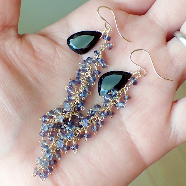 【メッセージジュエリー】〈14kgf〉翼ブラックオニキスと小粒アイオライトのロングピアス