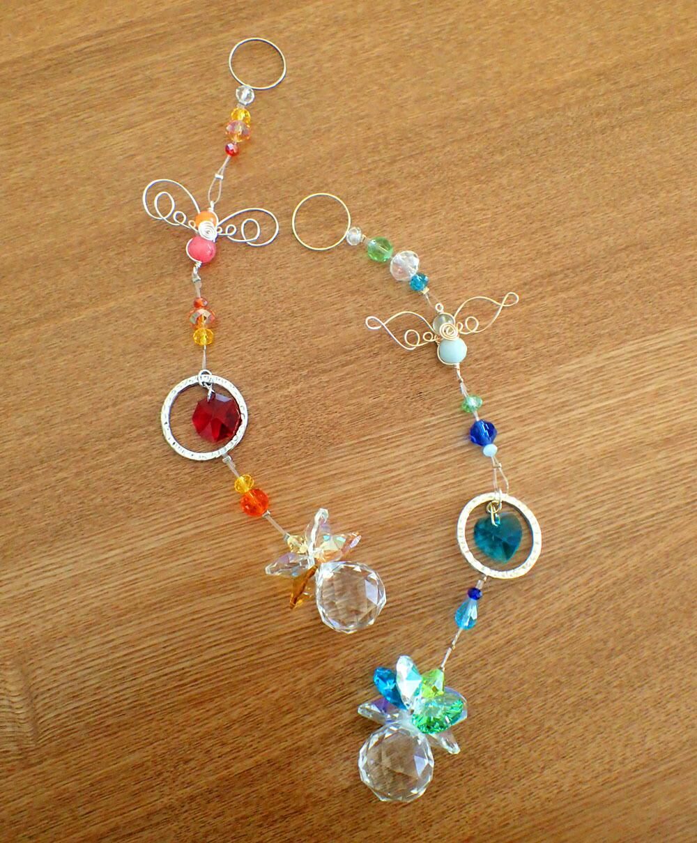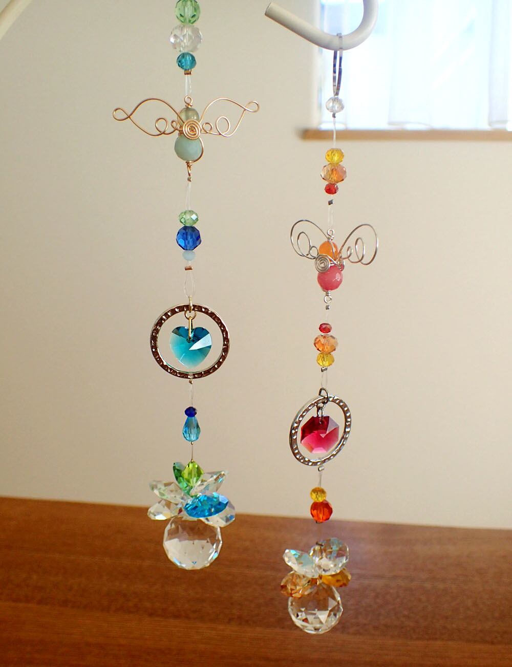ご覧になってくださり、ありがとうございます。カットの美しいスワロフスキーや色ガラスのビーズと天然石のワイヤー天使を組み合わせて、サンキャッチャーをお作りしました。一番下のクリスタルに光があたると、お部屋いっぱいに虹が現れます。サンキャッチャーは陽の氣を取り入る開運アイテムです。