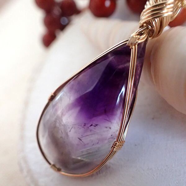 ご覧になってくださり、ありがとうございます。ミステリアスなグラデーションのアメジストを〈女神巻き®〉デザインでペンダントトップにしました。14金ゴールドフィルドワイヤーを使用しています。(※ネックレスチェーンは別売りです)