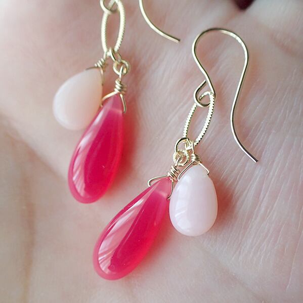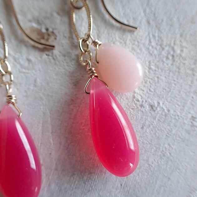 鮮やかなフューシャピンクカルセドニーと、桜の花びらのようなピンクオパールあわせてピアスをお創りしました。