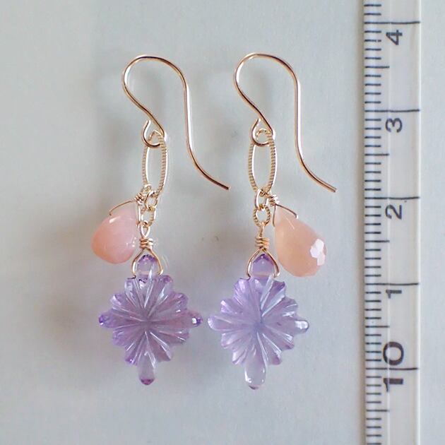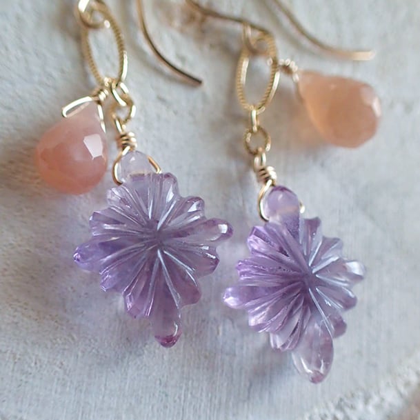 ローゼンジのアメジストと、カット入りのピーチムーンストーンをあわせて、ピアスをお創りしました。