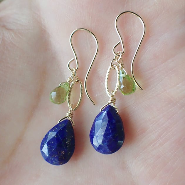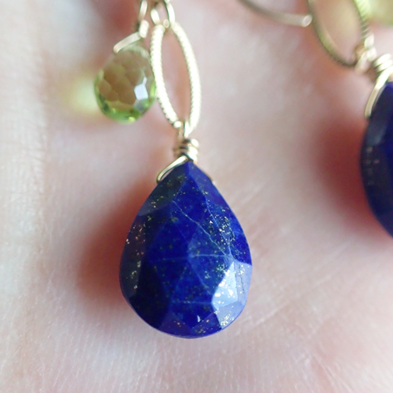 濃いネイビーのラピスラズリと、宝石質のペリドットをあわせて、ピアスをお創りしました。