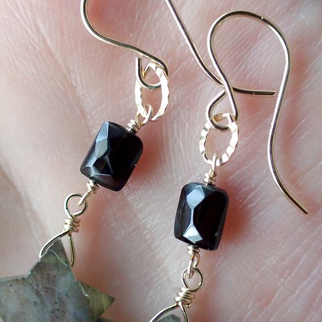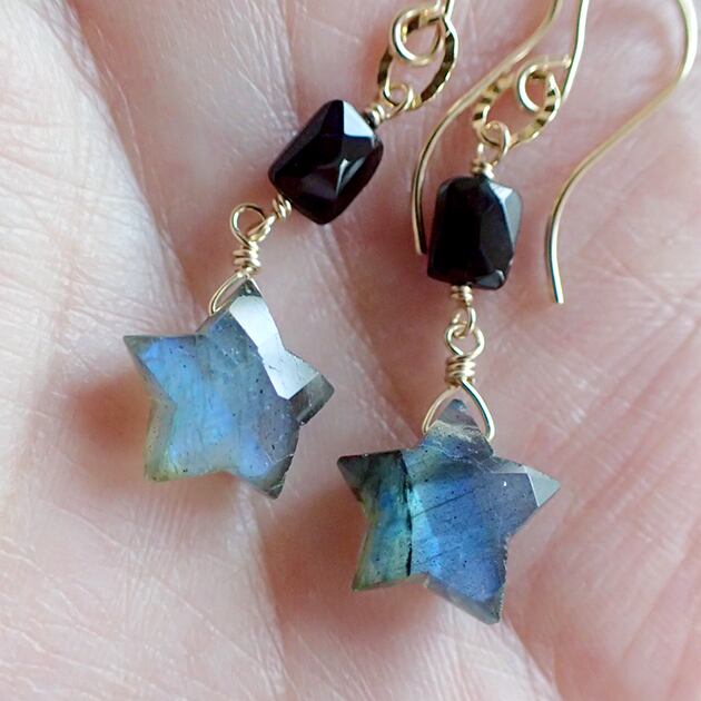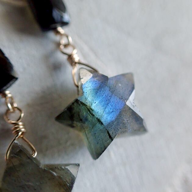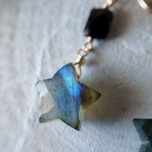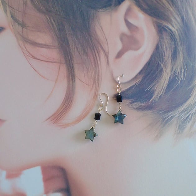 星型のラブラドライトと、四角いトルマリンをあわせて、ピアスをお創りしました。