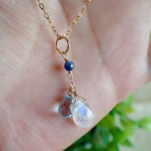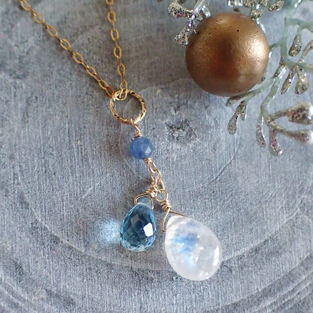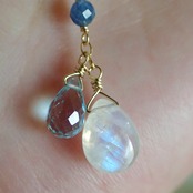 ほんのりと青い虹が出るレインボームーンストーンと、宝石ブルートパーズ、小粒カイヤナイトを組み合わせて、シンプルなチャームをお創りしました。