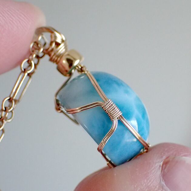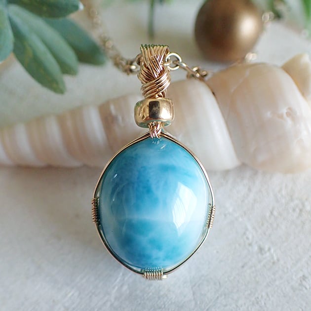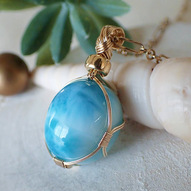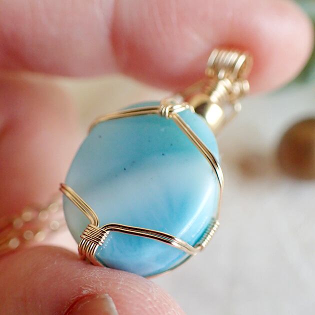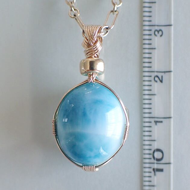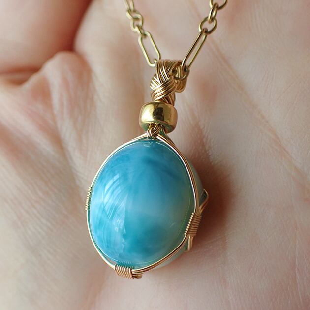 ドミニカ産ラリマーのカボションを女神巻き®ペンダントトップにお創りしました。