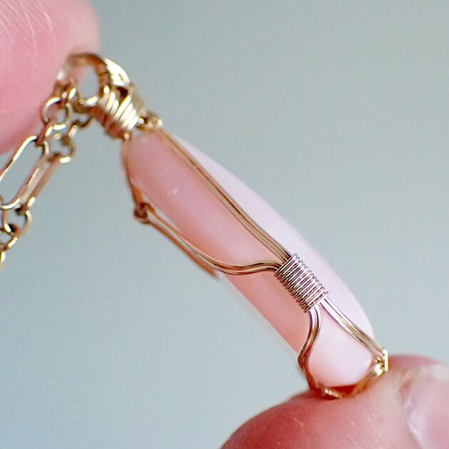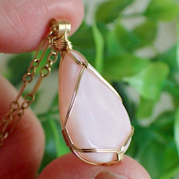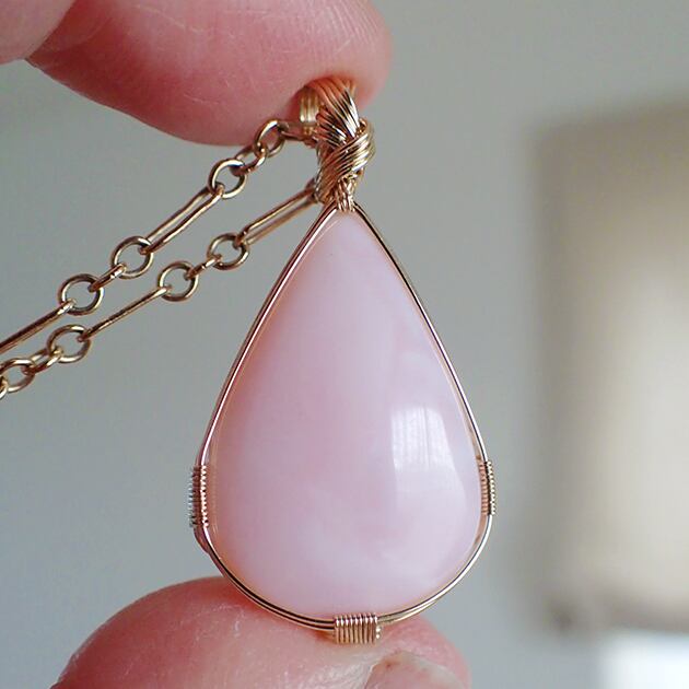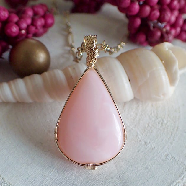 ピンクオパールの雫型カボションを女神巻き®ペンダントトップにお創りしました。