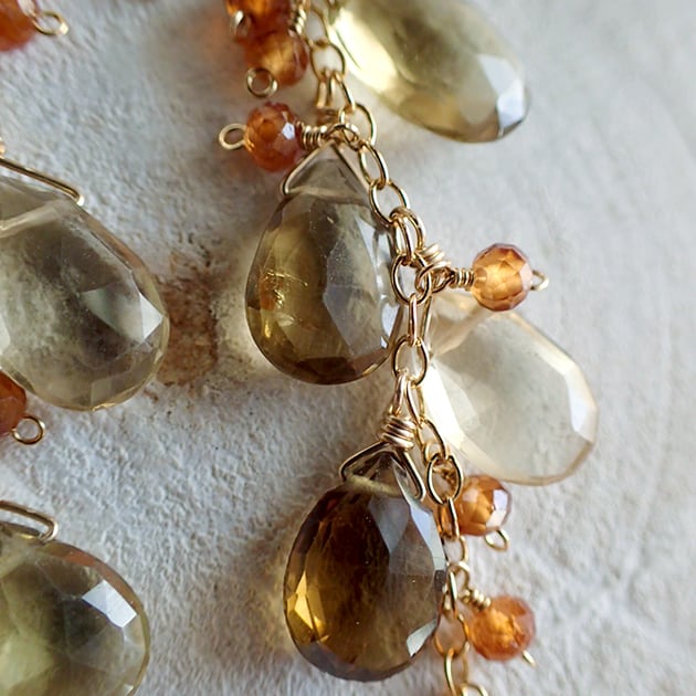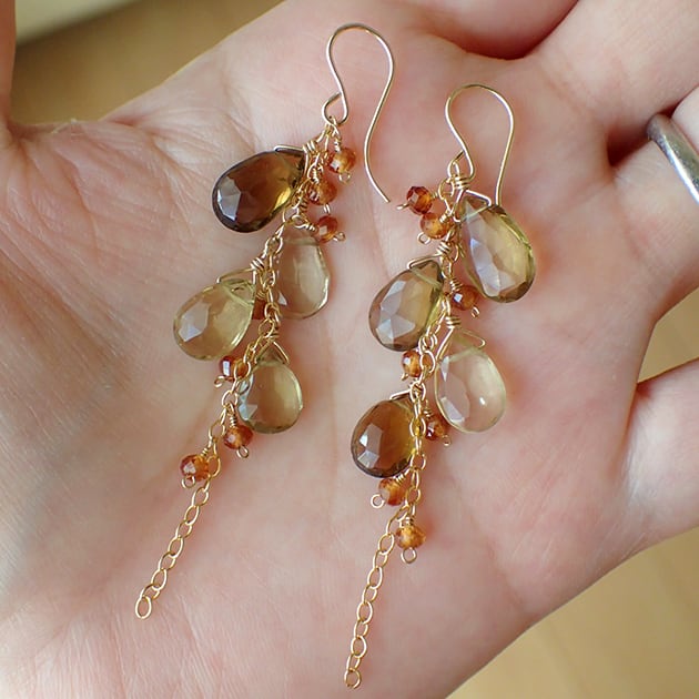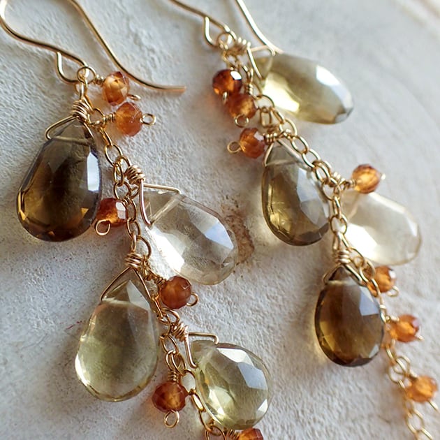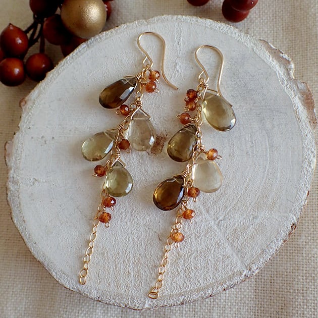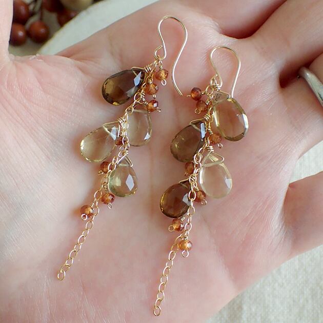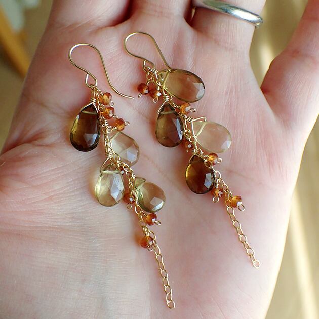 ブラウンからシャンパンカラーまで、さまざまな濃淡のスキャポライトに、芳ばしい色味の小粒ヘソナイト・ガーネットをあわせて、ロングピアスをお創りしました。