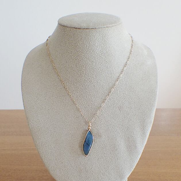 小ぶりなラブラドライトのリーフ型カボションを女神巻き®ペンダントトップにお創りしました。