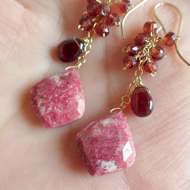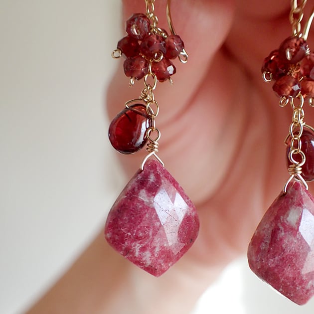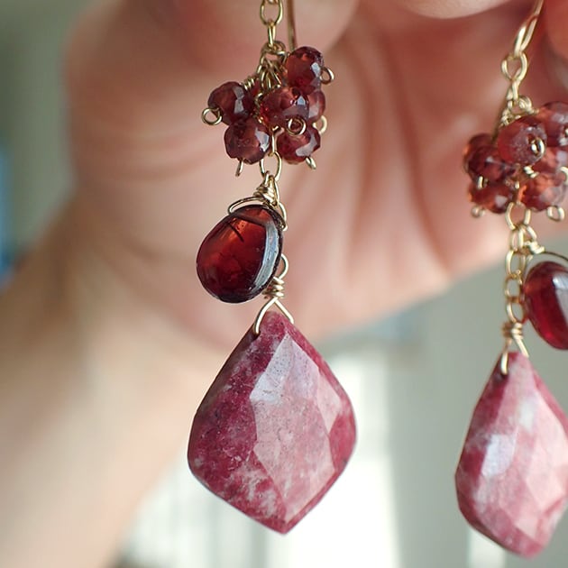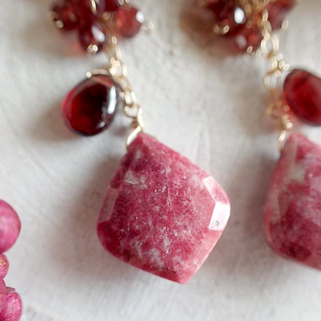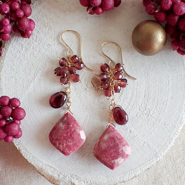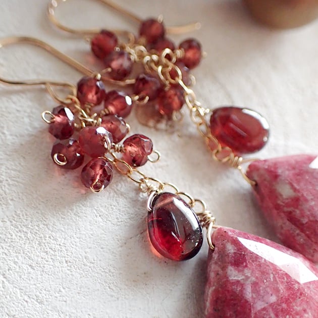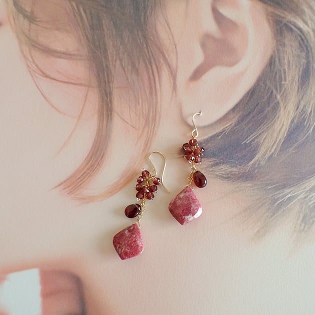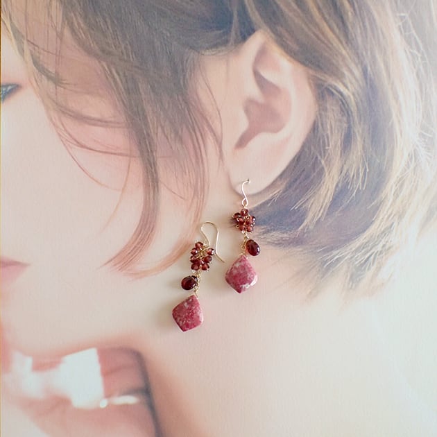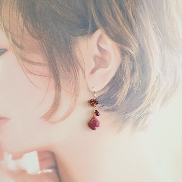 個性的な魅力を持つリーフ型のチューライトに、ガーネットを合わせて、ピアスをお創りしました。