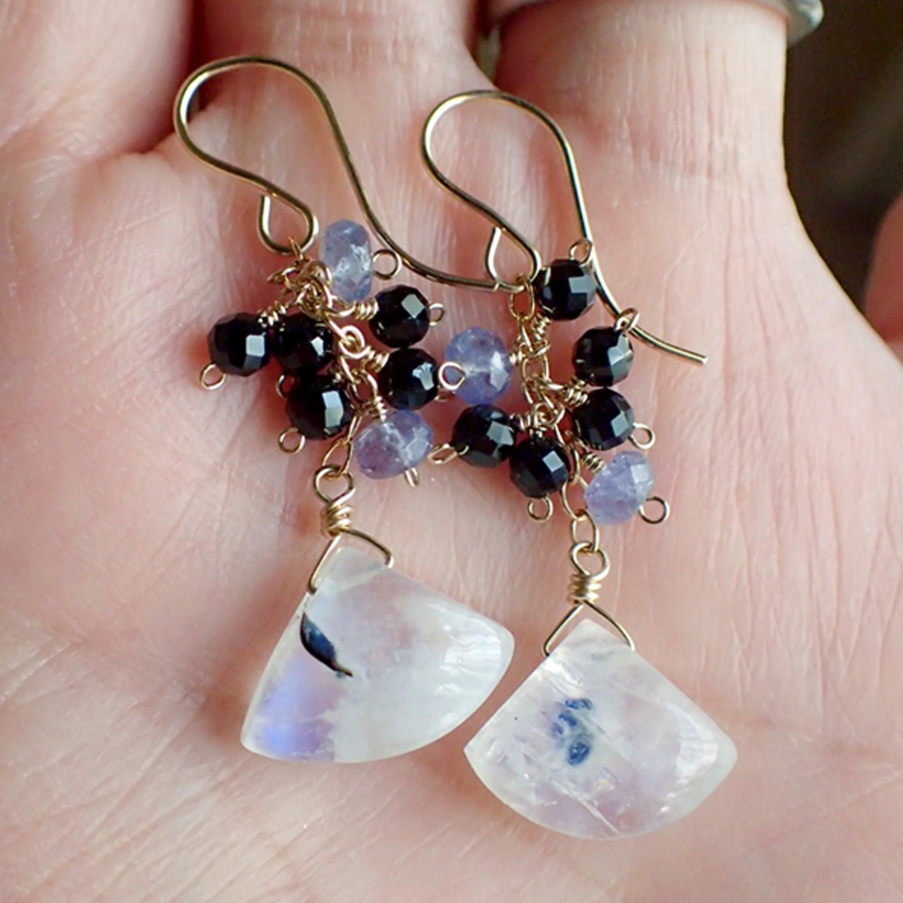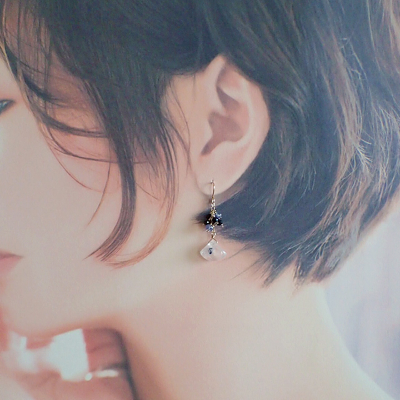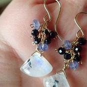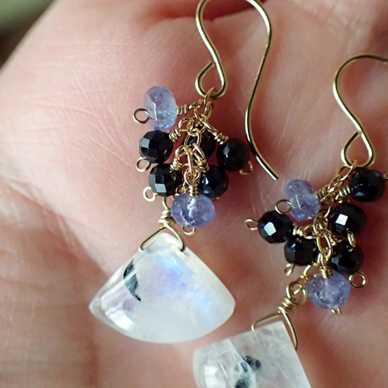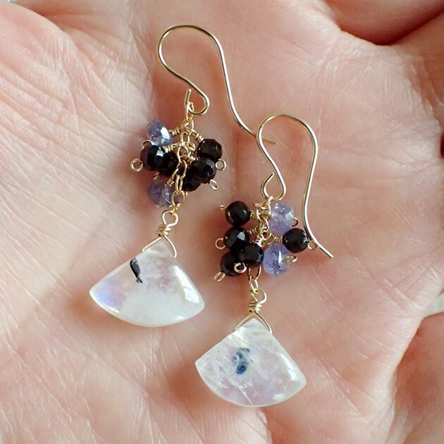 扇型のブラックトルマリン・イン・ブルームーンストーンに、小粒のブラックスピネルとタンザナイトを合わせてピアスをお創りしました。