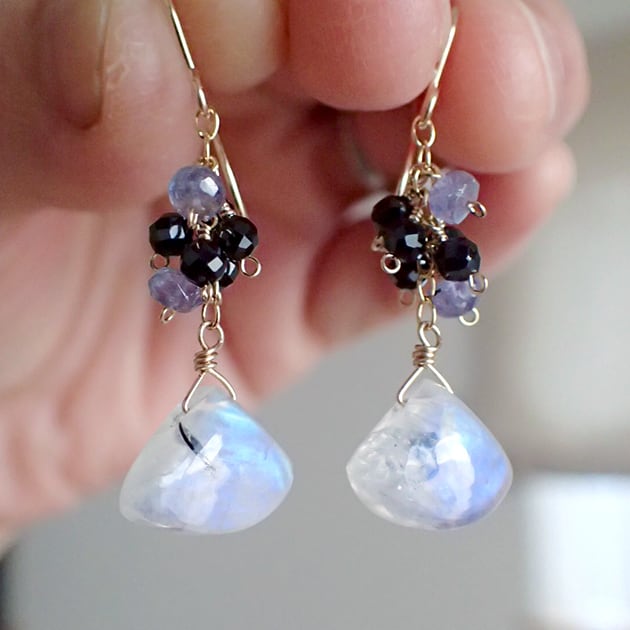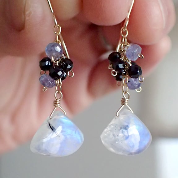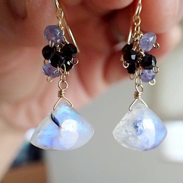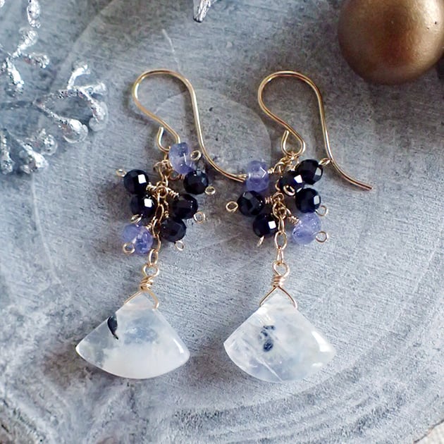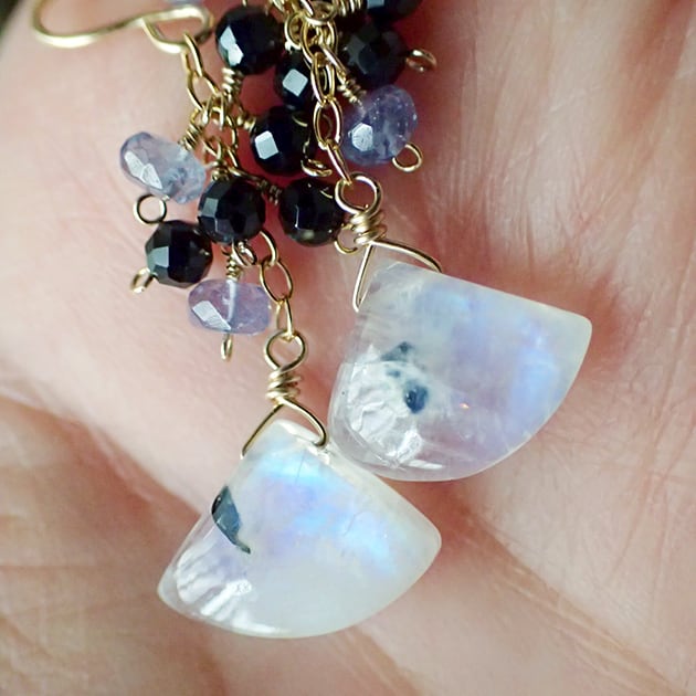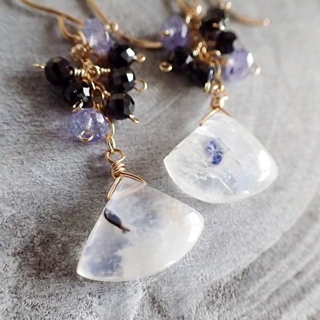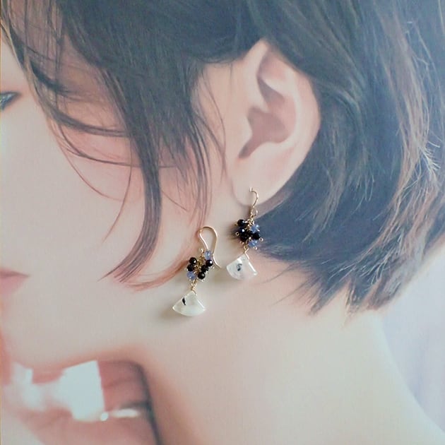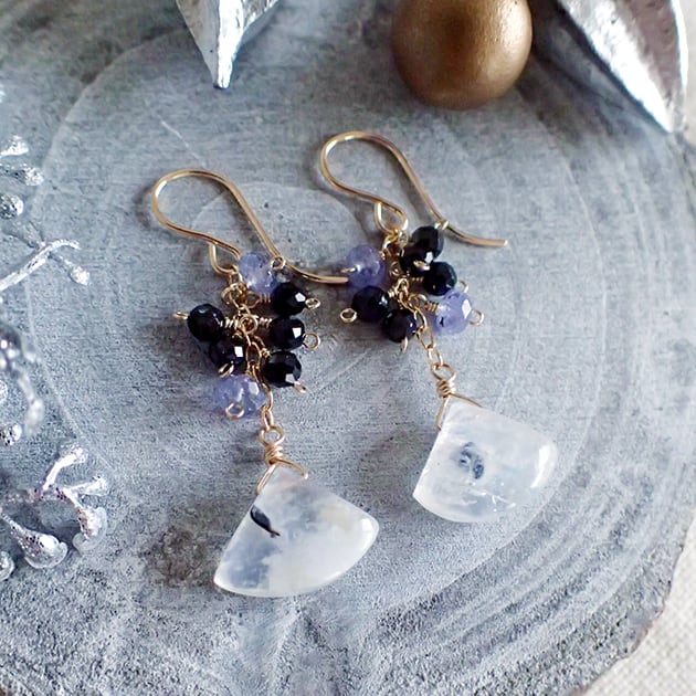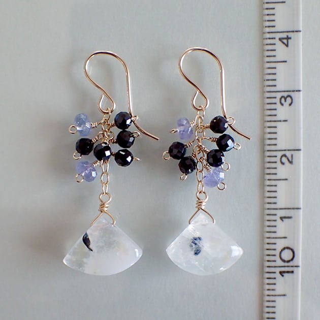 扇型のブラックトルマリン・イン・ブルームーンストーンに、小粒のブラックスピネルとタンザナイトを合わせてピアスをお創りしました。