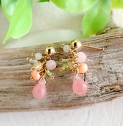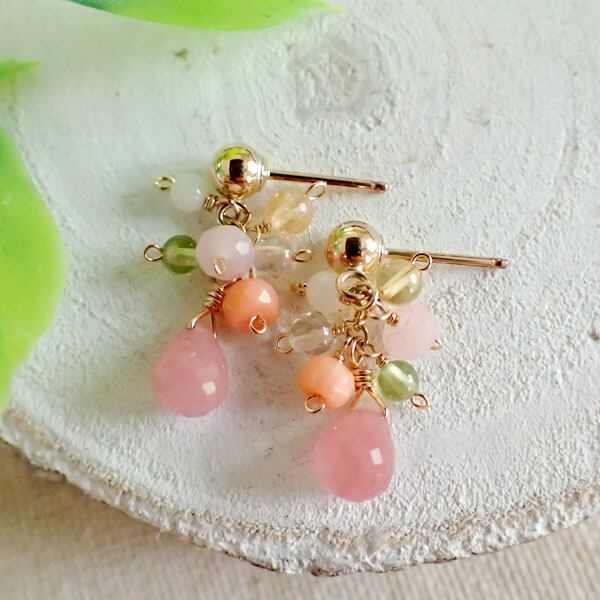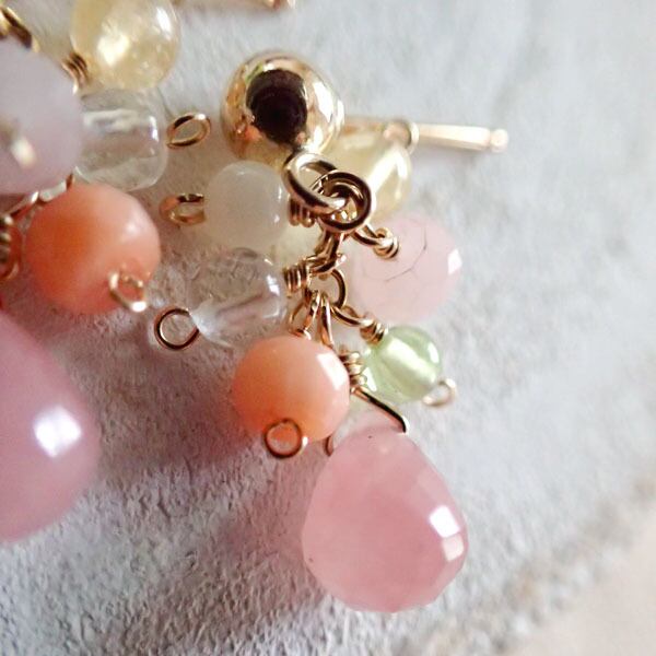 ご覧になってくださり、ありがとうございます。グァバクォーツとパステルカラーの小粒石をあわせて、小さなピアスにお仕立てしました。柔らかなトーンの石たちは、自然と身に着ける人の優しさや素直さを引き出してくれるように思います。14金ゴールドフィルドを使用しています。(※イヤリングへの変更は無料です)