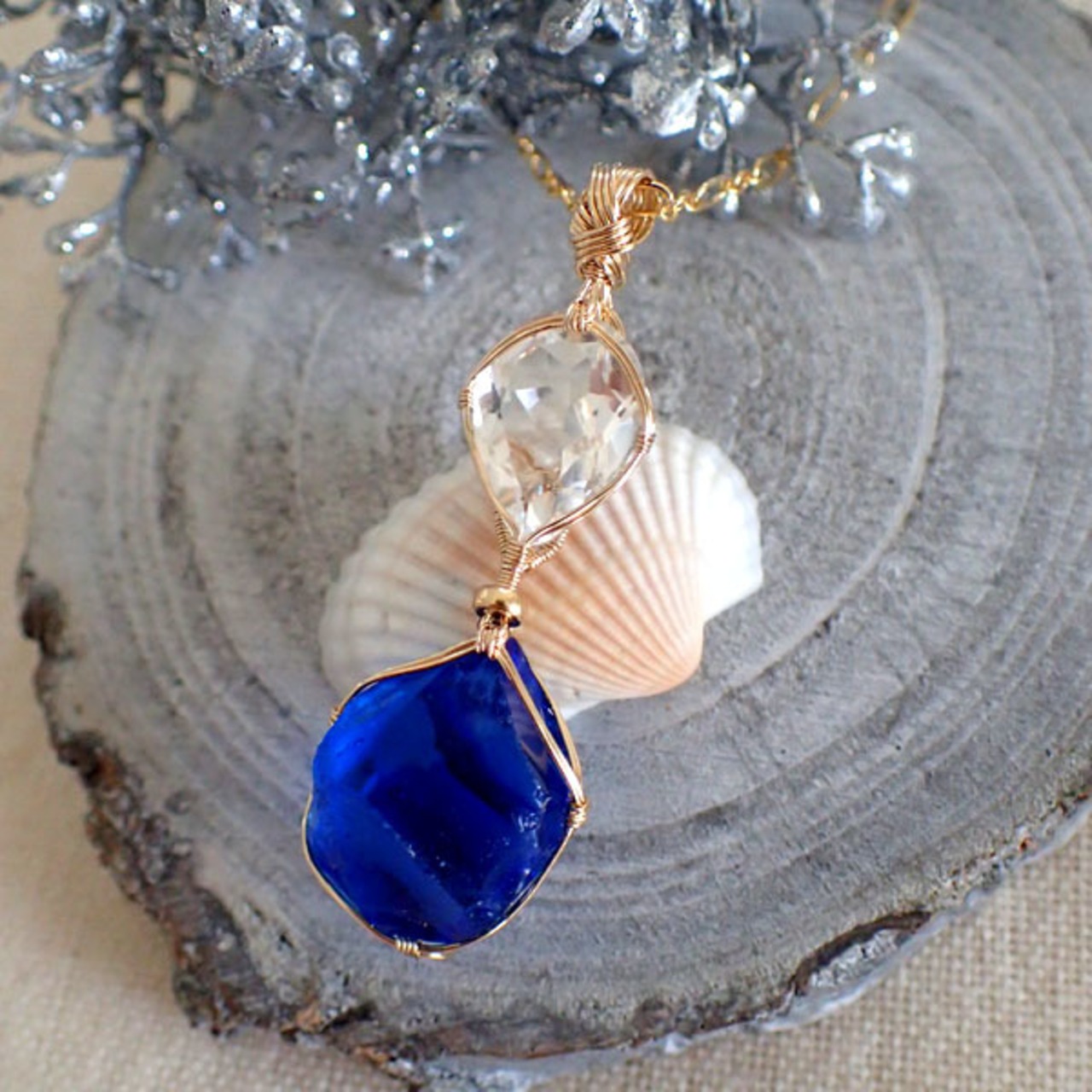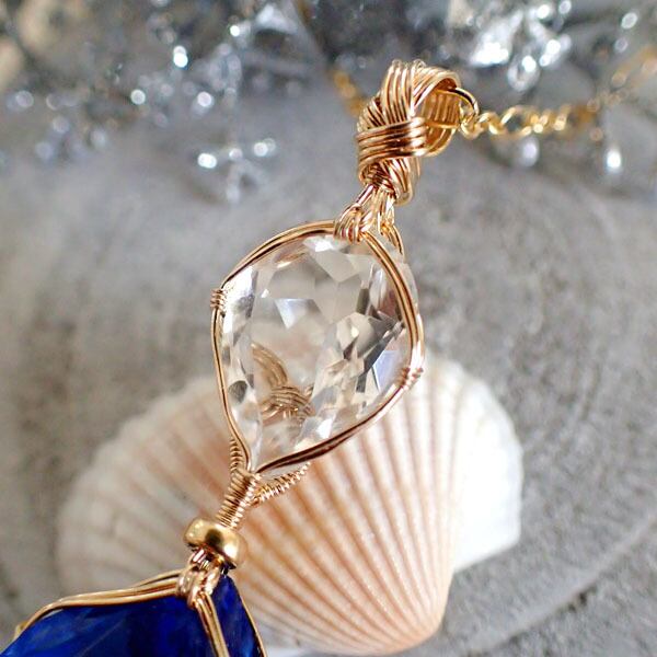 ご覧になってくださり、ありがとうございます。カットの美しい水晶とアンダラクリスタルを、〈女神巻き®〉デザインでツイン・ペンダントトップにお創りしました。14金ゴールドフィルドワイヤーを使用しています。(※ネックレスチェーンは別売りです)