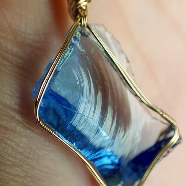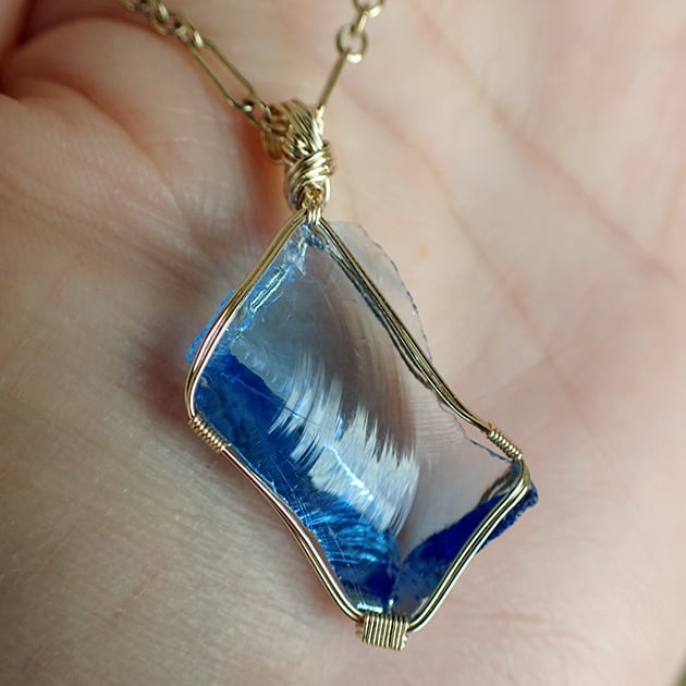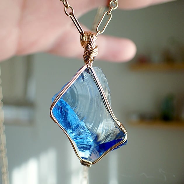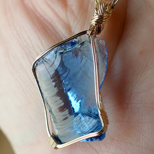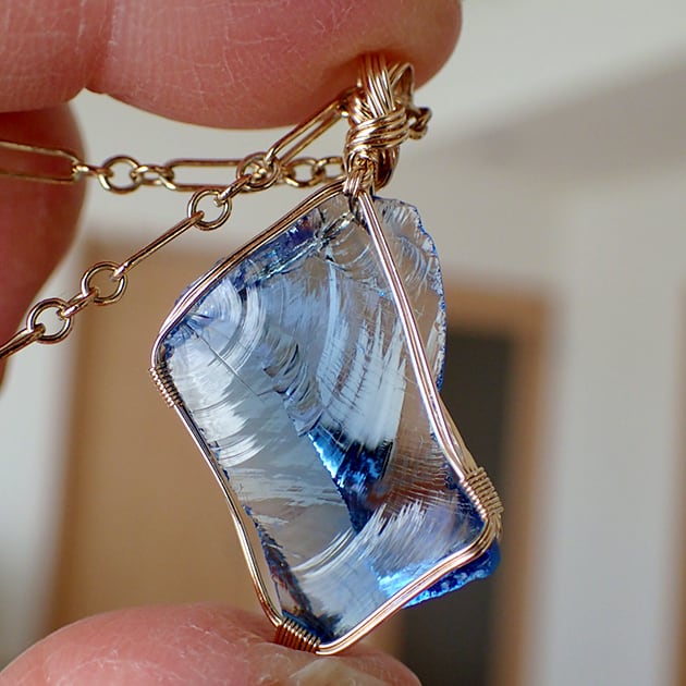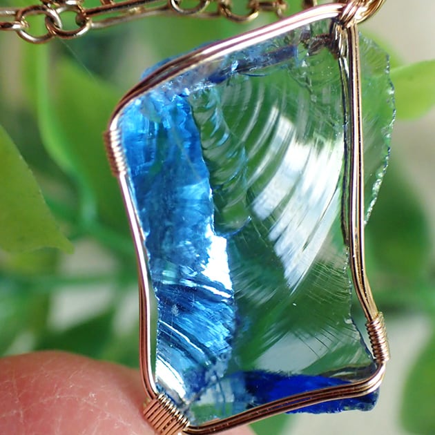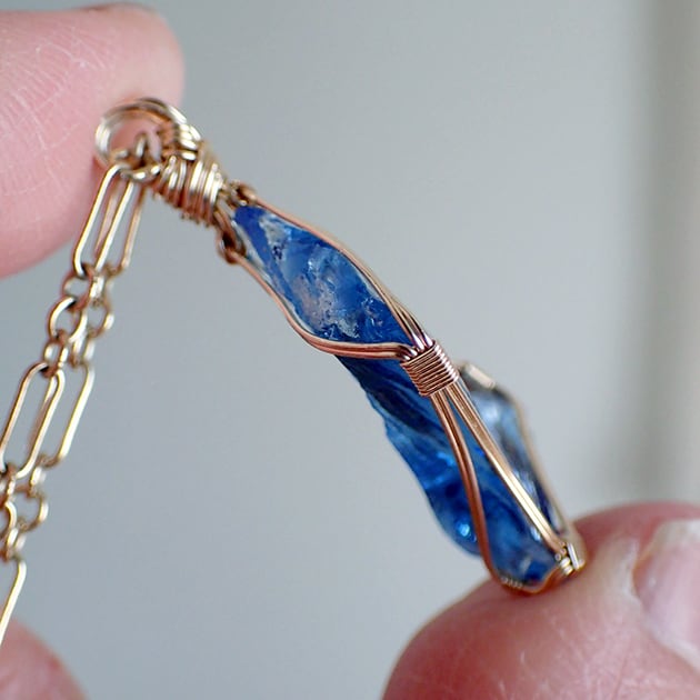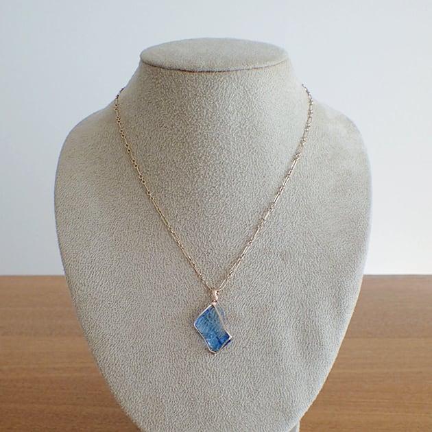 シエラネバダ産アンダラクリスタル、タンザナイトファイヤーの小さな原石を女神巻き®ペンダントトップにお創りしました。