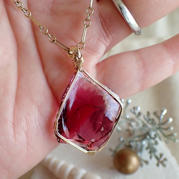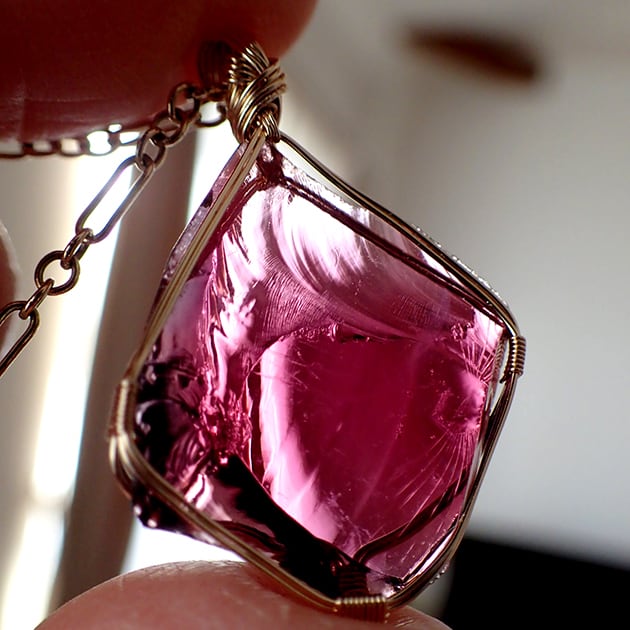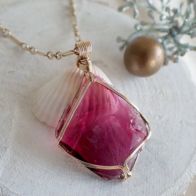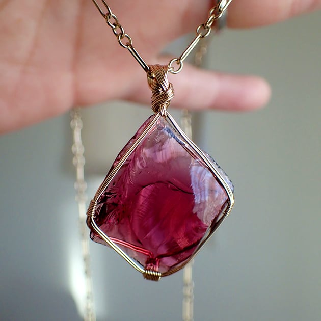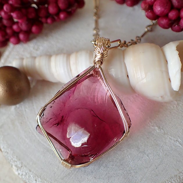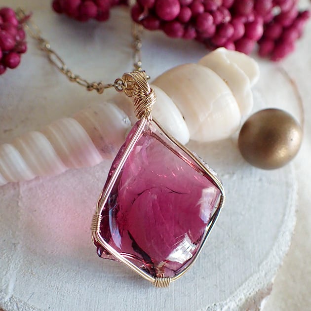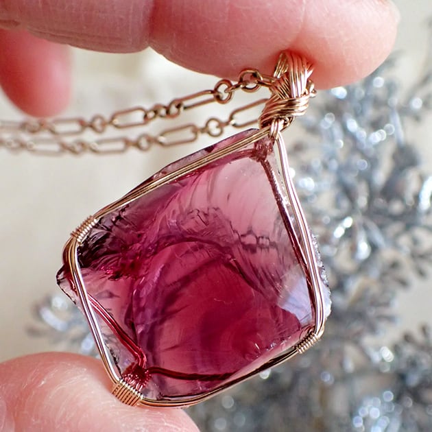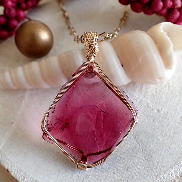 シエラネバダ産アンダラクリスタル、ラズベリーレゾナンスの小さな原石を女神巻き®ペンダントトップにお創りしました。