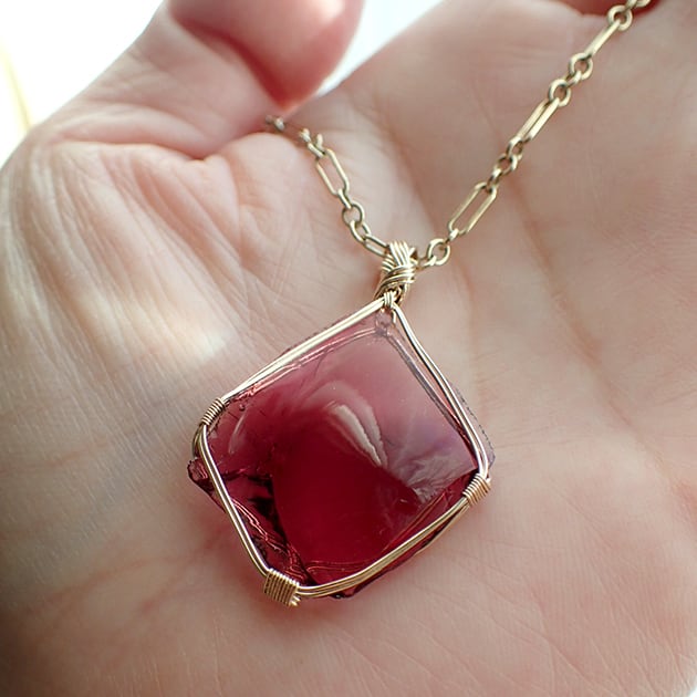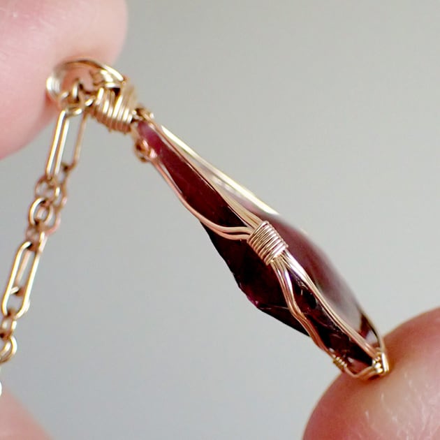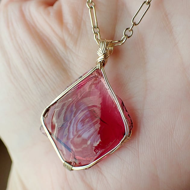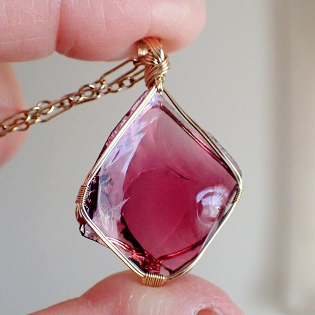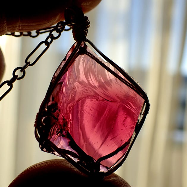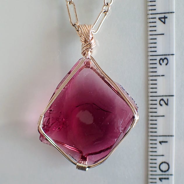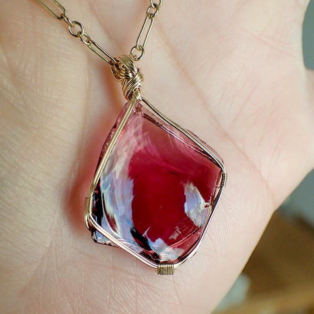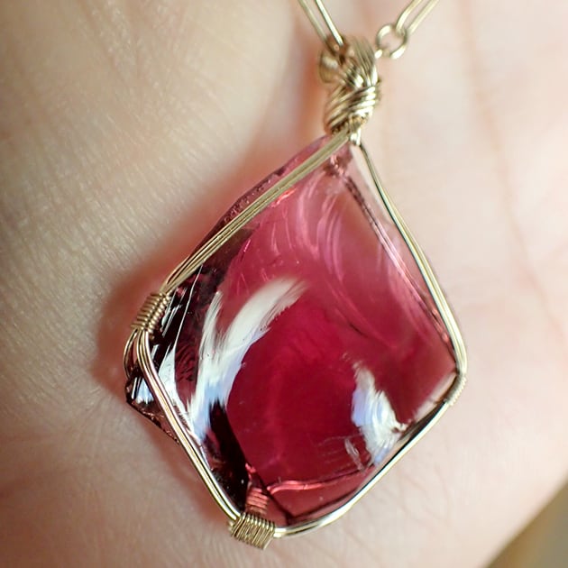 シエラネバダ産アンダラクリスタル、ラズベリーレゾナンスの小さな原石を女神巻き®ペンダントトップにお創りしました。
