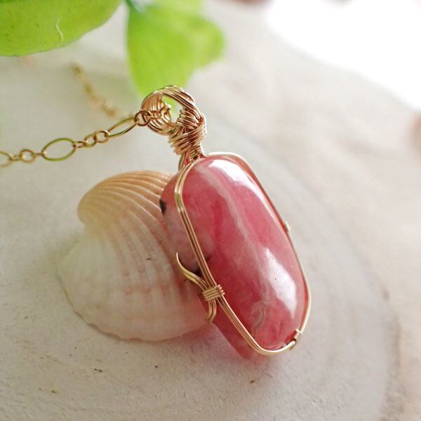 ご覧になってくださり、ありがとうございます。縞模様の美しいミルキーなロードクロサイトを〈女神巻き®〉デザインでペンダントトップにしました。14金ゴールドフィルドワイヤーを使用しています。(※ネックレスチェーンは別売りです)