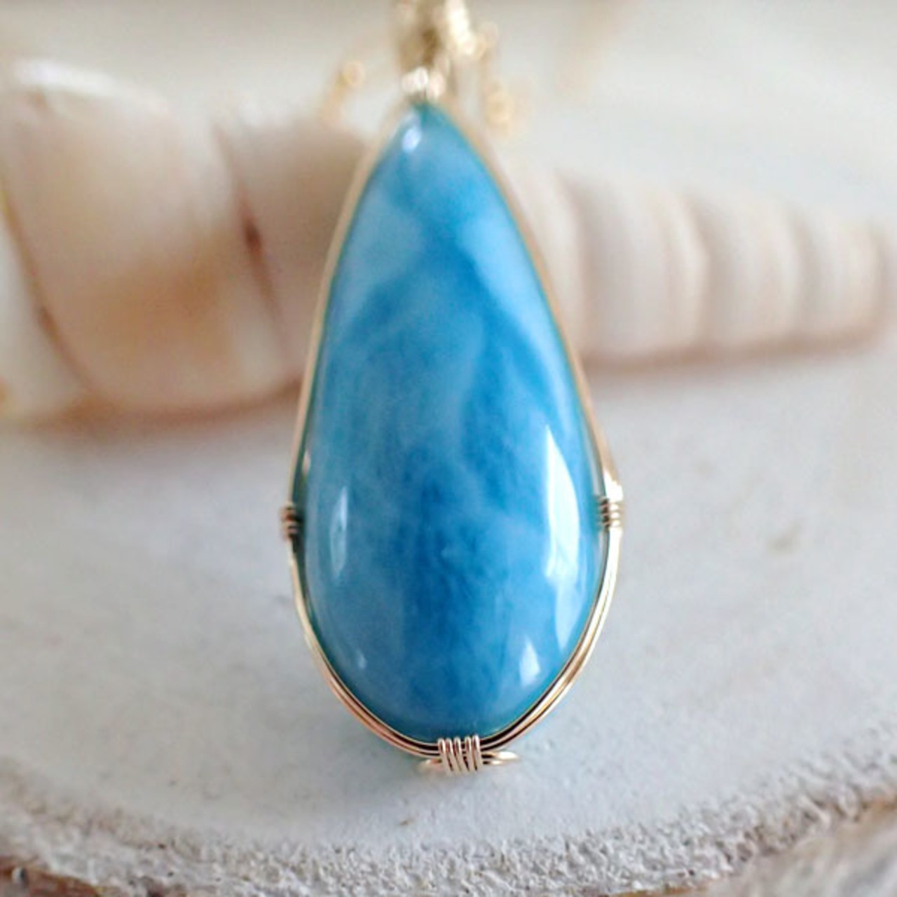 ご覧になってくださり、ありがとうございます。優しい海のようなラリマーを〈女神巻き®〉デザインでペンダントトップにしました。14金ゴールドフィルドワイヤーを使用しています。(※ネックレスチェーンは別売りです)