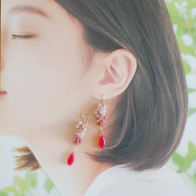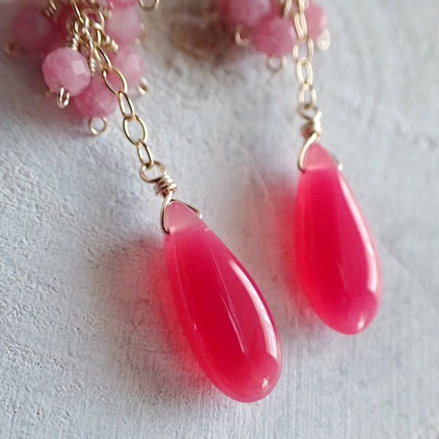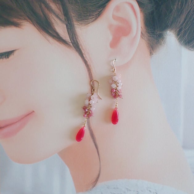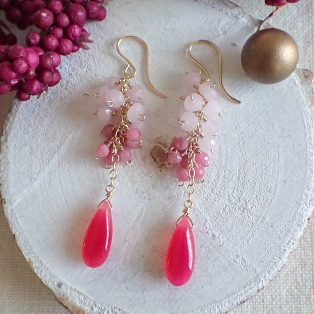 つやつやのフューシャピンクカルセドニーに、やわらかな印象のピンクの小粒石をたくさん添えてピアスをお創りしました。