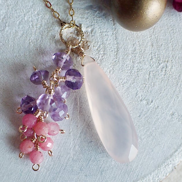 ラフなボタンカットのピンクアメジストと鮮やかなロードナイトの組合せは、絶妙な甘さと軽やかさです。