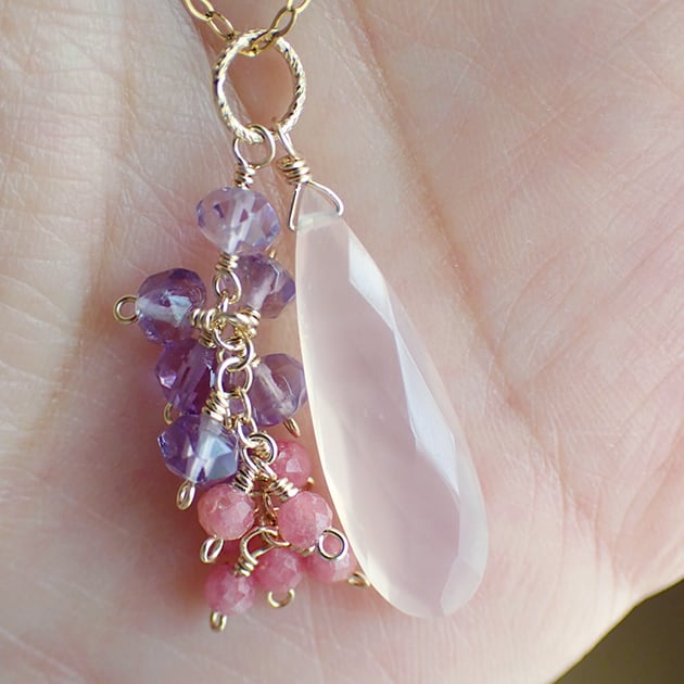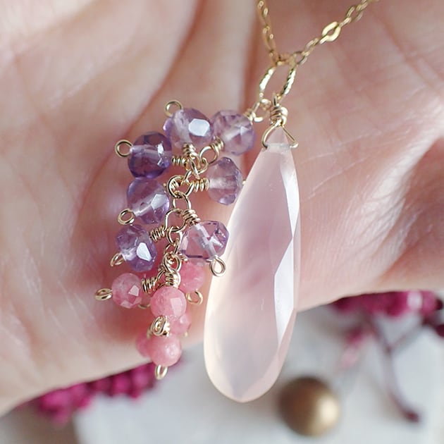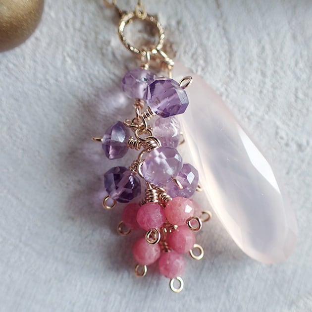 縦長の宝石カットのピンクカルセドニーに、小粒石をたくさん添えてチャームをお創りしました。