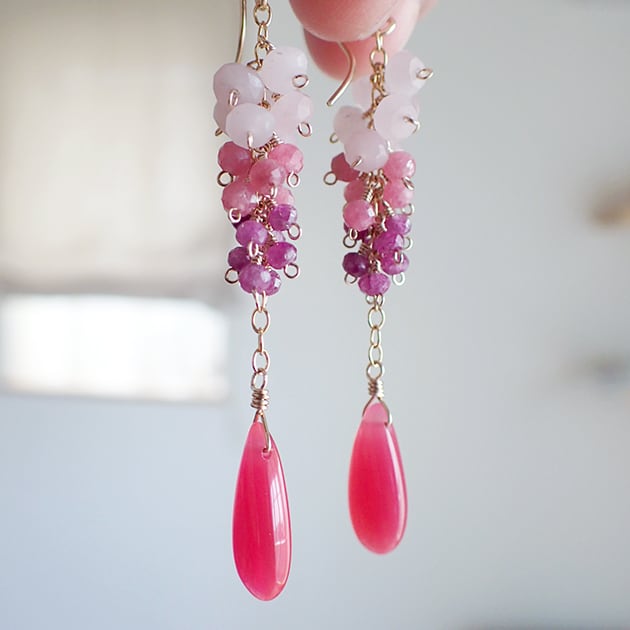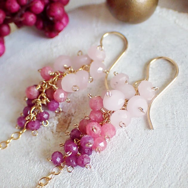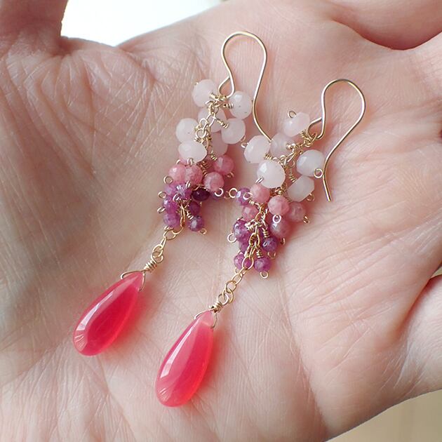 つやつやのフューシャピンクカルセドニーに、ルビーなど、ピンクの小粒石を合わせてピアスをお創りしました。
