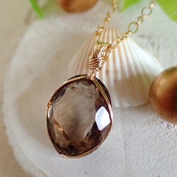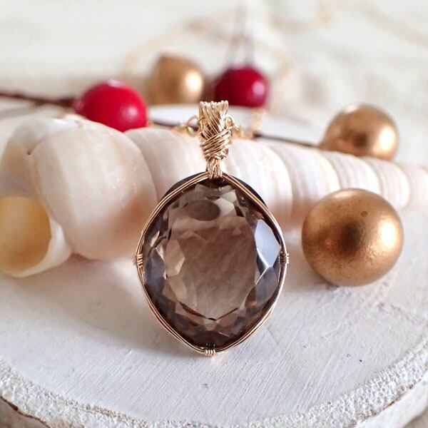 ご覧になってくださり、ありがとうございます。カットの美しいスモーキークォーツを〈女神巻き®〉デザインでペンダントトップにしました。しっとりと落ち着いた雰囲気のスモーキークォーツですが、光を受けてキラキラと輝きます。派手じゃないのに、華があります。14金ゴールドフィルドワイヤーを使用しています。(※ネックレスチェーンは別売りです)