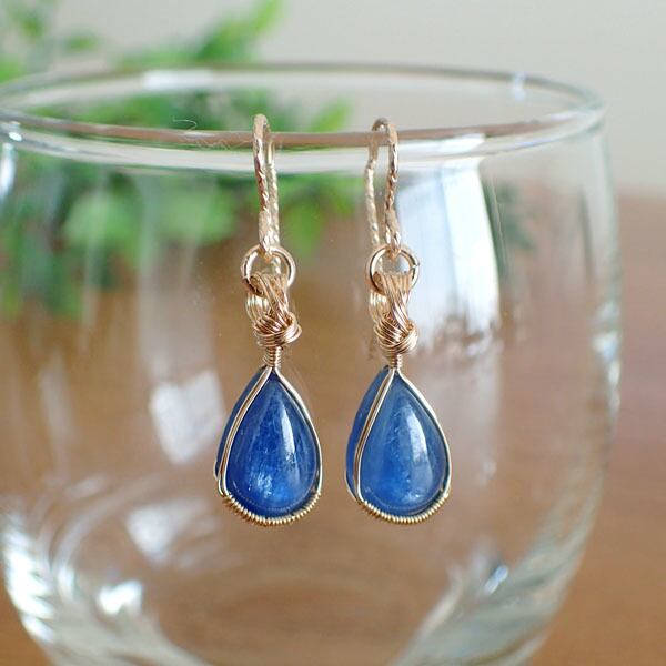 ご覧になってくださり、ありがとうございます。ドロップ型のカイヤナイトを〈女神巻き®〉デザインで一粒石のピアスにしました。落ち着いた雰囲気の中にも凛とした美しさ、高潔さを感じます。ピアスフックはキラキラのスパークル仕様です。14金ゴールドフィルドワイヤーを使用しています。(※イヤリングへの変更は無料です)