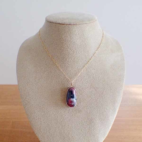 ご覧になってくださり、ありがとうございます。黒、白、ピンクの独特なミックスカラーが不思議な魅力のユーディアライトを、〈女神巻き®〉デザインでペンダントトップにしました。手頃なサイズながら、しっかりとした厚み、重みがあり、ボリュームを感じます。14金ゴールドフィルドワイヤーを使用しています。(※ネックレスチェーンは別売りです)