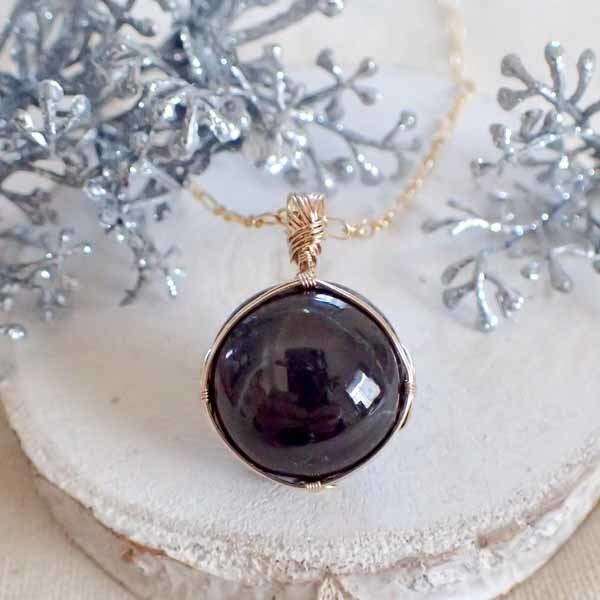 ご覧になってくださり、ありがとうございます。まん丸なブラックスターを、〈女神巻き®〉デザインでペンダントトップにしました。光の当たる具合によって、地色の黒に十文字の星が輝きます。14金ゴールドフィルドワイヤーを使用しています。(※ネックレスチェーンは別売りです)