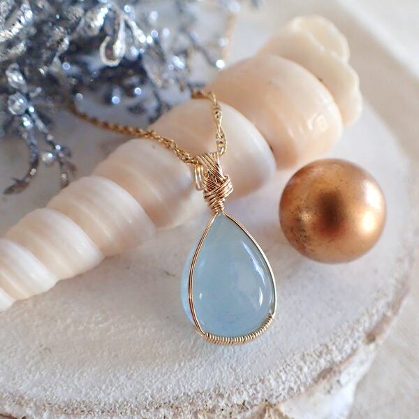 ご覧になってくださり、ありがとうございます。まあるいドロップ型のアクアマリンを〈女神巻き®〉デザインでペンダントトップにしました。小さくて指先にのるほどの一粒ですが、ミルキーでとろみのある水色がとても優しい印象です。14金ゴールドフィルドワイヤーを使用しています。(※ネックレスチェーンは別売りです)