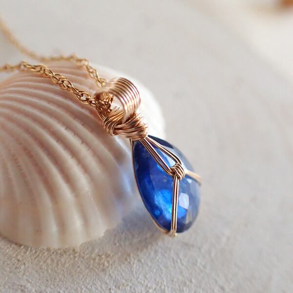 ご覧になってくださり、ありがとうございます。ドロップ型のカイヤナイトを〈女神巻き®〉デザインでペンダントトップにしました。とても小さな一粒ですが透明度が高く、深いブルーに引き込まれます。またカット入りで光を受けて輝きます。普段の装いにプラスすれば、さり気なくクラスアップできるジュエリーです。14金ゴールドフィルドワイヤーを使用しています。(※ネックレスチェーンは別売りです)