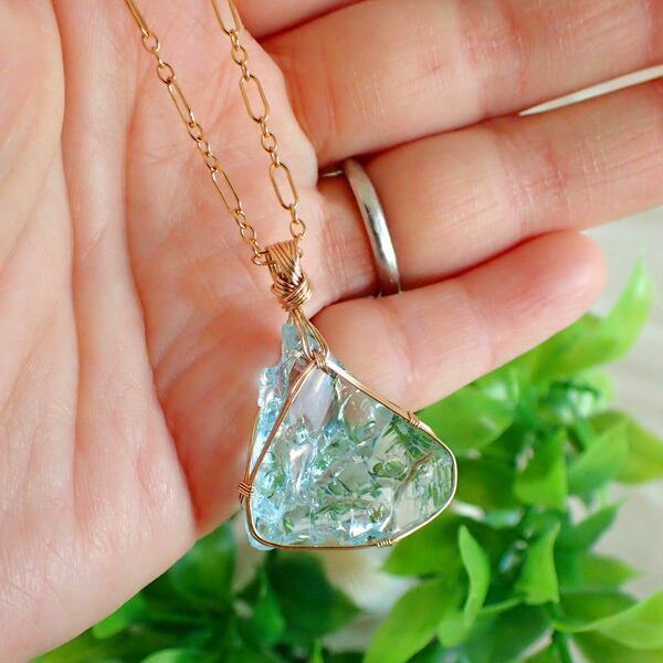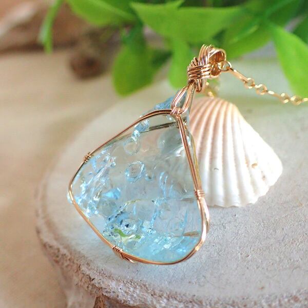 ご覧になってくださり、ありがとうございます。光のようなライトブルーのアンダラクリスタルを、〈女神巻き®〉デザインでペンダントトップにしました。クリスタルを覗き込めば、清浄な泉にダイブしたような感覚になる、気泡いっぱいの美しいアンダラです。身に着けやすい手頃な大きさも魅力です。14金ゴールドフィルドワイヤーを使用しています。(※ネックレスチェーンは別売りです)
