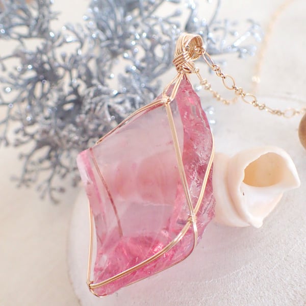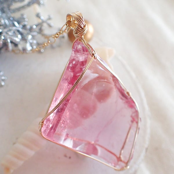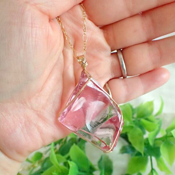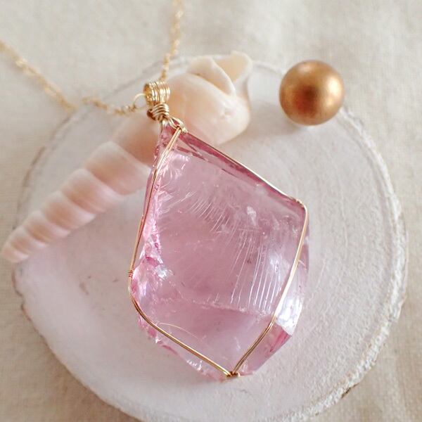 ご覧になってくださり、ありがとうございます。どこかスモーキーなニュアンスも感じるローズピンクのアンダラクリスタルを、〈女神巻き®〉デザインでペンダントトップにしました。ダイヤ型のフォルムがとても美しく、滑らかな表面からは穏やかな氣質、上品さを感じます。近年、シエラネバダ産のピンク系アンダラクリスタルは本当に入手困難で、私の手元にもなかなか巡ってこないのが現状です。14金ゴールドフィルドワイヤーを使用しています。(※ネックレスチェーンは別売りです)