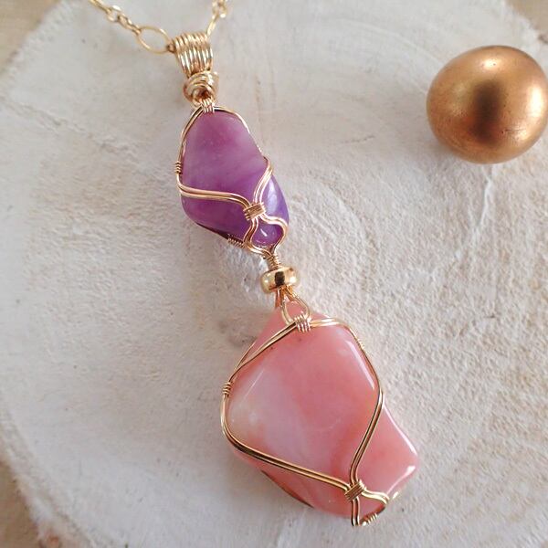 ご覧になってくださり、ありがとうございます。スギライトとピンクオパールのタンブルを組み合わせて〈女神巻き®〉デザインのツインペンダントトップにお創りしました。邪気祓いの意味合いがあるスギライトですが、この石の見た目は一般的なものよりもかなりソフトで、女性的な印象です。愛され石であるピンクオパールともぴったりマッチしています。守られながら安心して自分らしく開花していく女性をイメージしました。14金ゴールドフィルドワイヤーを使用しています。(※ネックレスチェーンは別売りです)