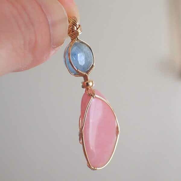 ご覧になってくださり、ありがとうございます。明るい色味が珍しいカイヤナイトと、ピンクオパールを組み合わせて〈女神巻き®〉デザインのツインペンダントトップにお創りしました。14金ゴールドフィルドワイヤーを使用しています。(※ネックレスチェーンは別売りです)