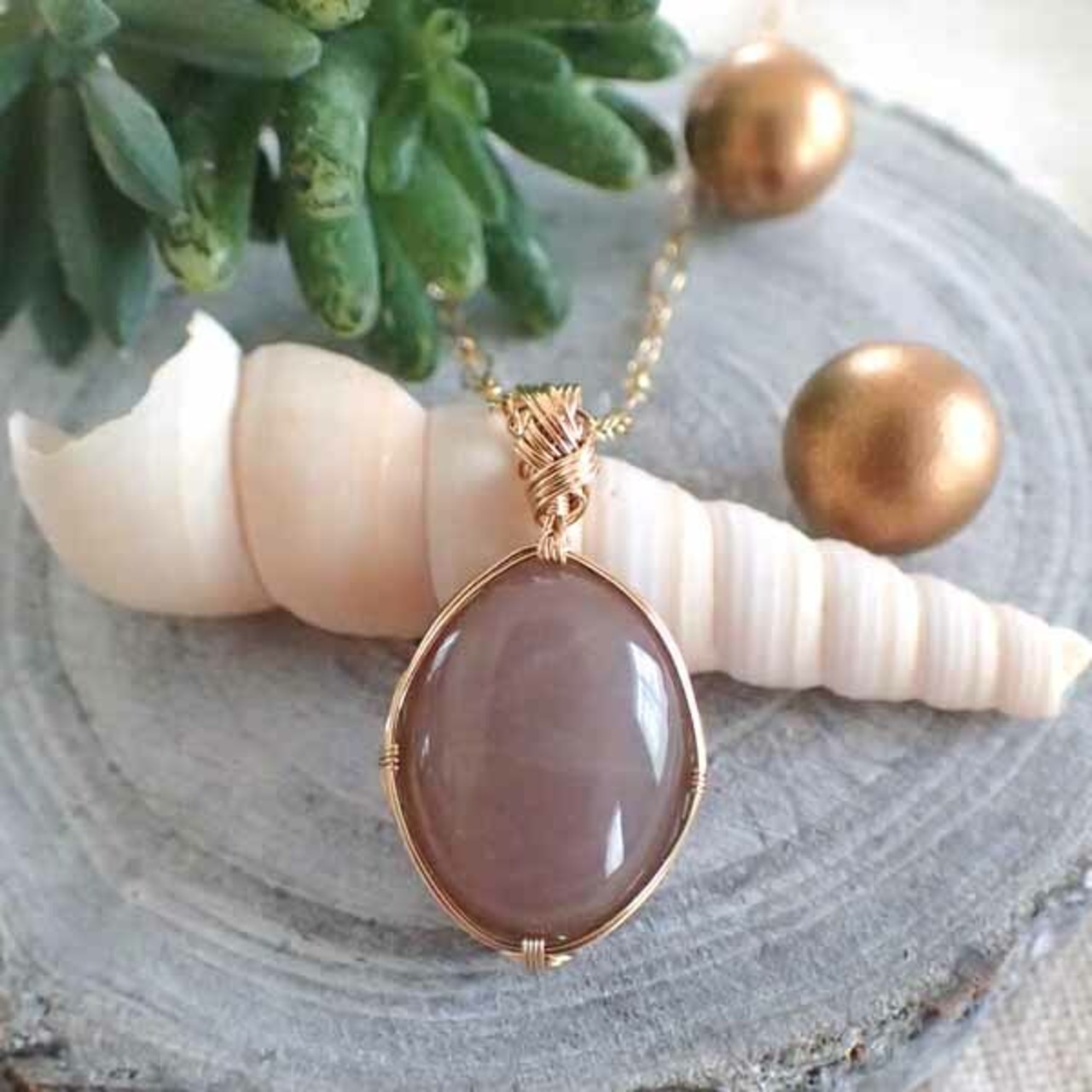 ご覧になってくださり、ありがとうございます。オーバル型のブラウンムーンストーンを〈女神巻き®〉デザインでペンダントトップにしました。こっくりと深みのあるグレー味を帯びたブラウンが、とても芳醇な印象です。またムーンストーンの特徴とも言える表面のシアーな質感がミステリアスな魅力を添えています。決して目立つわけではないけれど、さり気ない上質さを醸す大人のジュエリーです。14金ゴールドフィルドワイヤーを使用しています。(※ネックレスチェーンは別売りです)