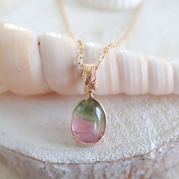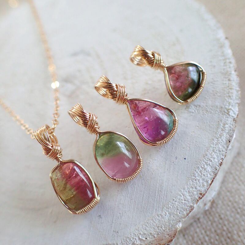 ご覧になってくださり、ありがとうございます。小粒のウォーターメロン・トルマリンを〈女神巻き®〉デザインでペンダントトップにしました。グリーン、ピンクとも、ほのかにミルキーなニュアンスを帯びた色味が魅力です。キュートな2色マカロンのようなジュエリーです。14金ゴールドフィルドワイヤーを使用しています。(※40cmの14kgf製ネックレスチェーンをお付けします)