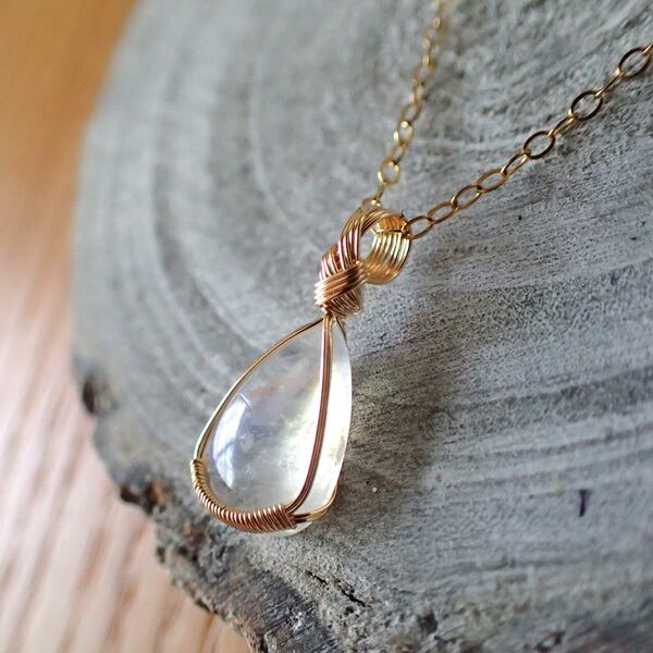 ご覧になってくださり、ありがとうございます。小粒のムーンストーンを〈女神巻き®〉デザインでペンダントトップにしました。透明度の高い乳白色にブルーの虹が見える、とても美しい一粒です。指先にちょこんと乗るほどの小粒サイズも魅力です。14金ゴールドフィルドワイヤーを使用しています。(※ネックレスチェーンは別売りです)