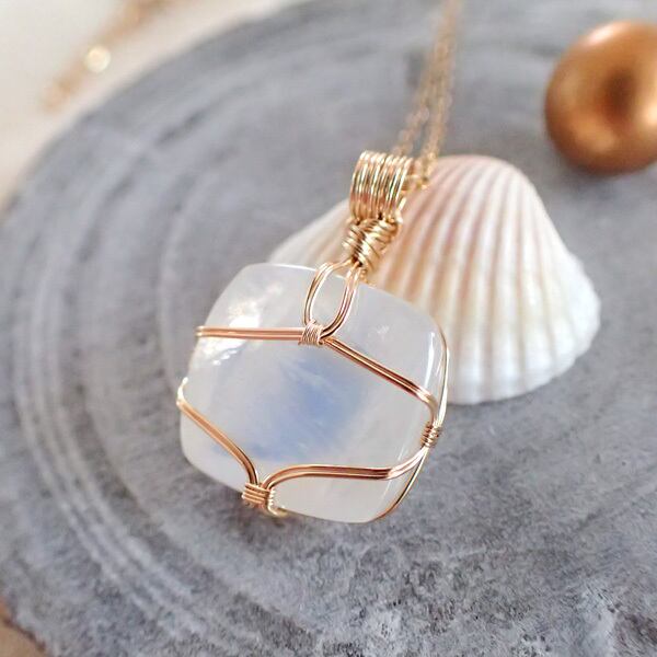 ご覧になってくださり、ありがとうございます。角の丸いスクエア型ムーンストーンを〈女神巻き®〉デザインでペンダントトップにしました。きちんとしているように見えて、ゆるりと抜けた雰囲気も併せ持つ、不思議な印象のクリスタルです。淡々とした毎日のルーティーンは、退屈でも安心。その安心感を据え置いたまま、ちょっと冒険もしてみたい人へ。美味しいとこ取りです♡14金ゴールドフィルドワイヤーを使用しています。(※ネックレスチェーンは別売りです)