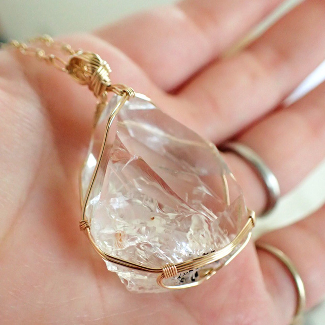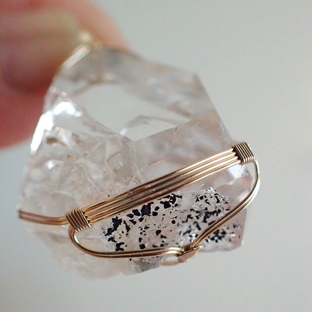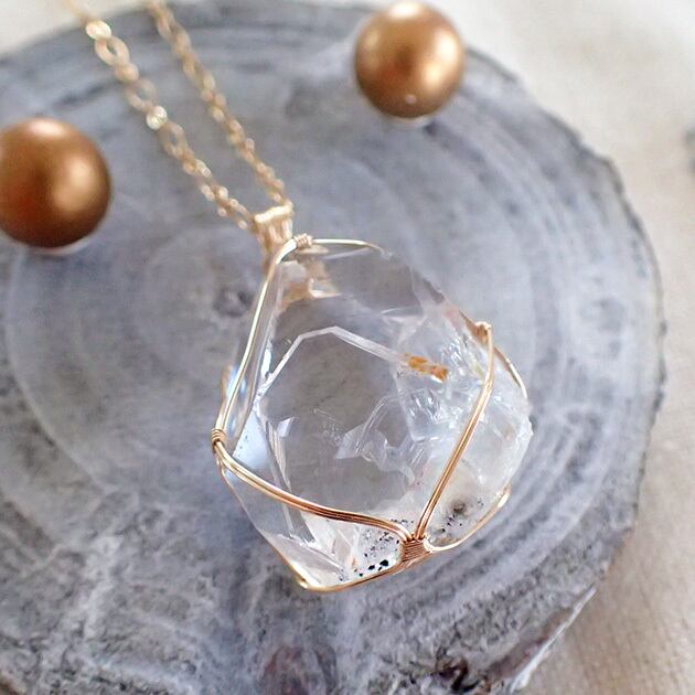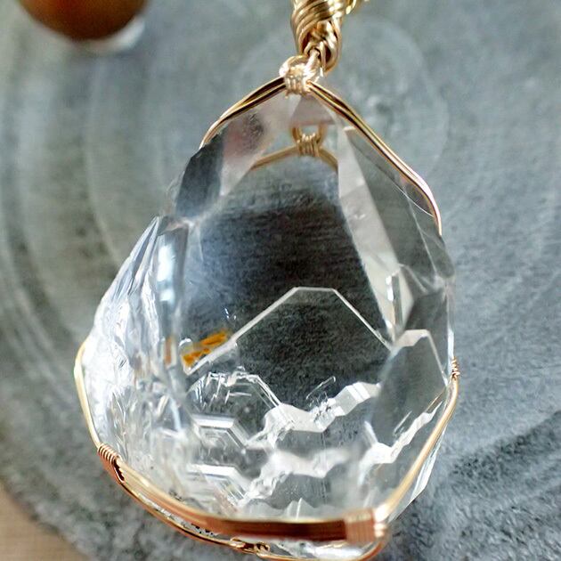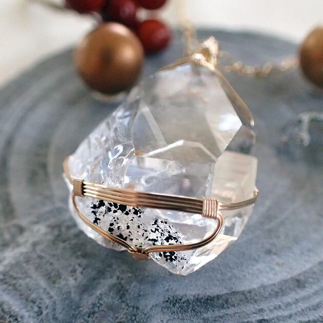 ご覧になってくださり、ありがとうございます。大粒のハーキマーダイヤモンドを〈女神巻き®〉デザインでペンダントトップにしました。素晴らしい透明感に、ずっしりと心地の良いボリュームです。当初考えていた石の向きとは逆に仕上がりました。どうしても制作がスムーズに進まず、ある時『逆さに巻いてみようか?』と思ったら、そこから順調に形になりました。完成したクリスタルを覗き込んで驚きました。富士山が見えます!だからこの向きでなければならなかったのか、と納得しました。14金ゴールドフィルドワイヤーを使用しています。(※ネックレスチェーンは別売りです)