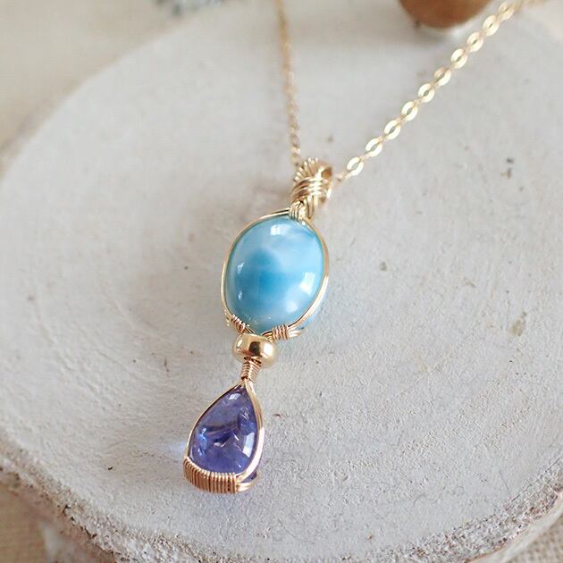 ご覧になってくださり、ありがとうございます。模様の美しい小粒のラリマーと、発色の鮮やかな小粒のタンザナイトを〈女神巻き®〉デザインでツインペンダントトップにしました。14金ゴールドフィルドワイヤーを使用しています。(※ネックレスチェーンは別売りです)