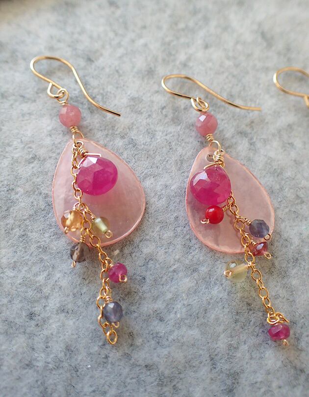 ご覧になってくださり、ありがとうございます。色鮮やかなルビーと繊細で淡い色合いのシェルを合わせて、プリンセスのようなピアスにしました。色とりどりの小粒石たちは、左右で少し異なったものがランダムにデザインされています。秋冬のシンプルで色味を抑えた装いにもパっと映える、オンリーワンのジュエリーです。14金ゴールドフィルドを使用しています。(※イヤリングへの変更は無料です)