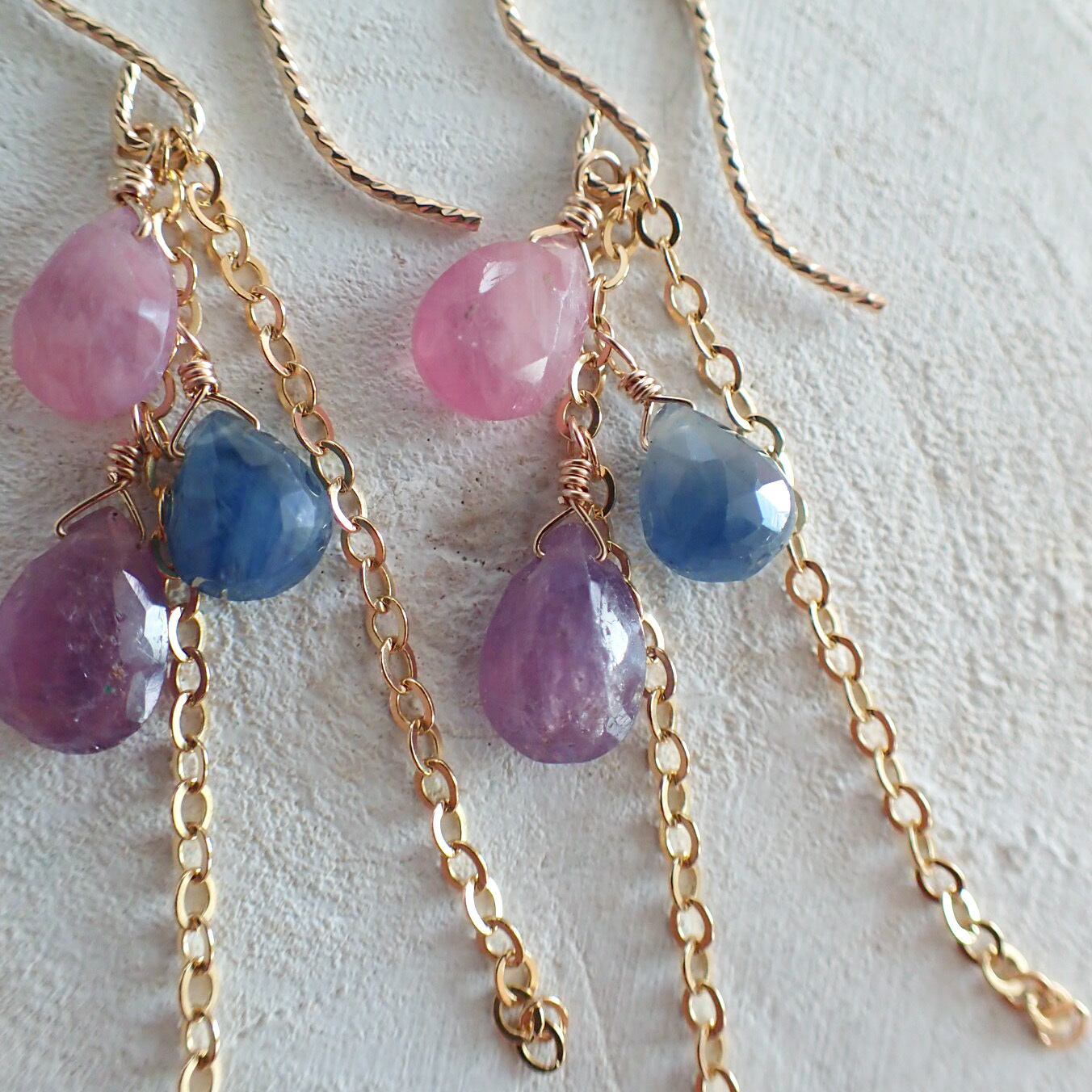 色とりどりのカラーサファイアでロングピアスをお創りしました。揺れてキラキラと輝くロングのチェーンも魅力です。