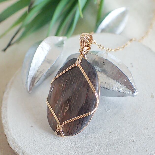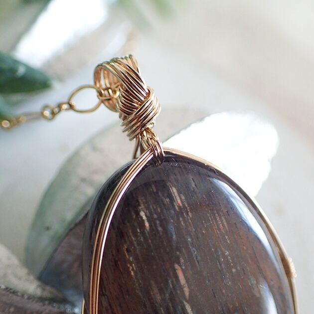 ご覧になってくださり、ありがとうございます。タンザニア産のサンストーンを〈女神巻き®〉デザインでペンダントトップにしました。サンストーンの名称ですが、一般的に見られる鮮やかなオレンジ色のものからは程遠いダークな色味で、ほの暗い中の輝きです。このようなサンストーンは流通上でブラックサンストーンと呼ばれることがあるのだそうです。