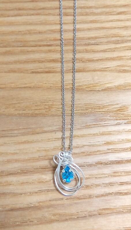 ドロップ型のブルートパーズのルースをワイヤーでペンダントトップにしました。