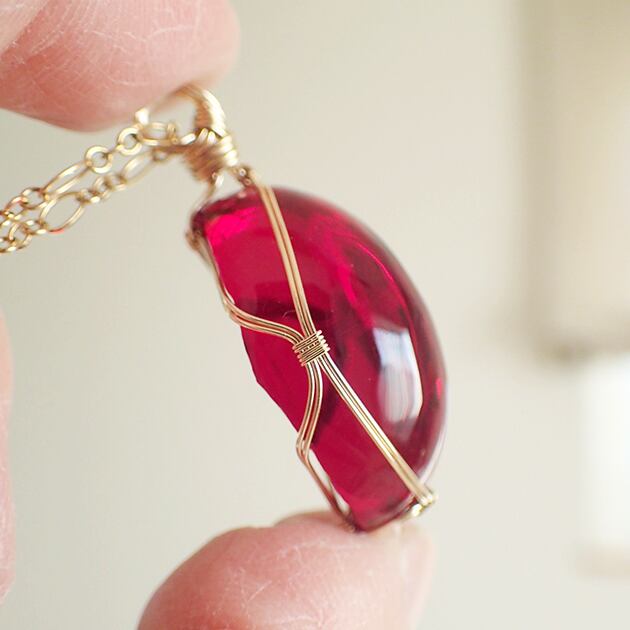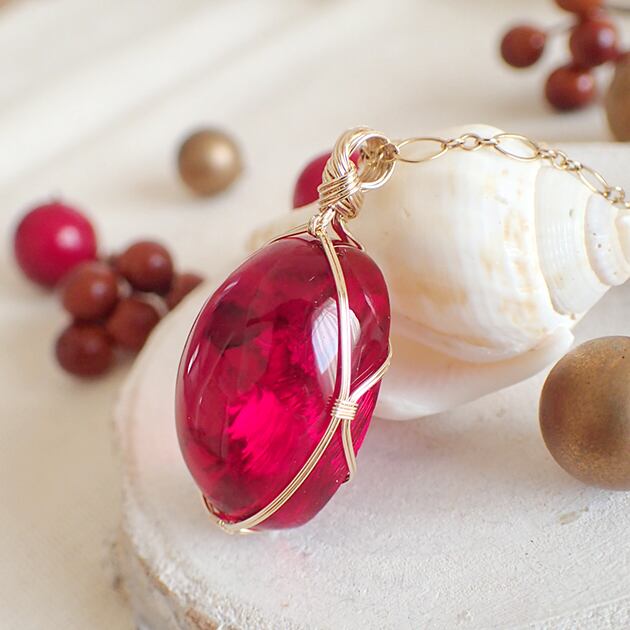 ご覧になってくださり、ありがとうございます。原石の美しさを残しながら、つややかに研磨された真っ赤なアンダラクリスタルのカボションを〈女神巻き®〉デザインでペンダントトップにしました。