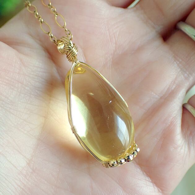 ご覧になってくださり、ありがとうございます。陽の光とも、月の光とも感じる軽やかな黄金色のアンダラクリスタルを〈女神巻き®〉デザインでペンダントトップにしました。カボションのように見えますが、まぁるく自然なフォルムに磨かれたタンブルです。