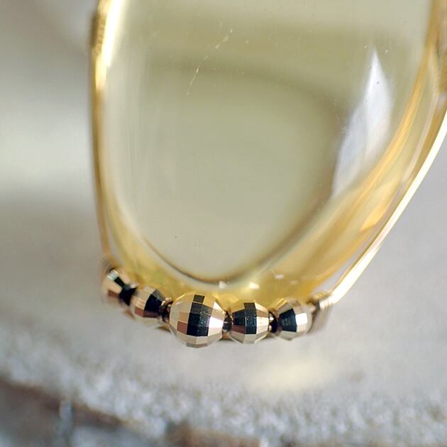 ・14金ゴールドフィルドワイヤーと10Kビーズを使用しています。とても軟らかい素材ですので、硬い物にぶつけたり、落としたりしないでください。破損の原因となります。